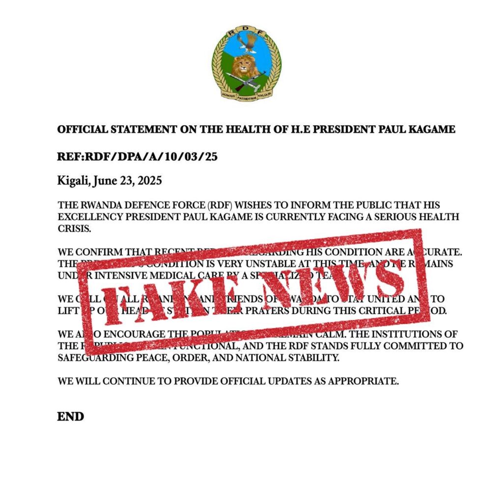The postings which claimed to have been issued by the army surfaced on Monday, June 23, asserted that President Kagame was experiencing a “serious health crisis” and was under intensive medical care.